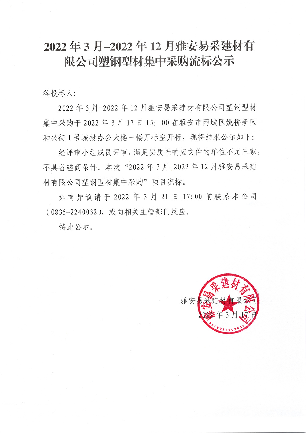 2022年3月-2022年12月雅安易采建材有限公司塑鋼型材集中采購流標(biāo)公示