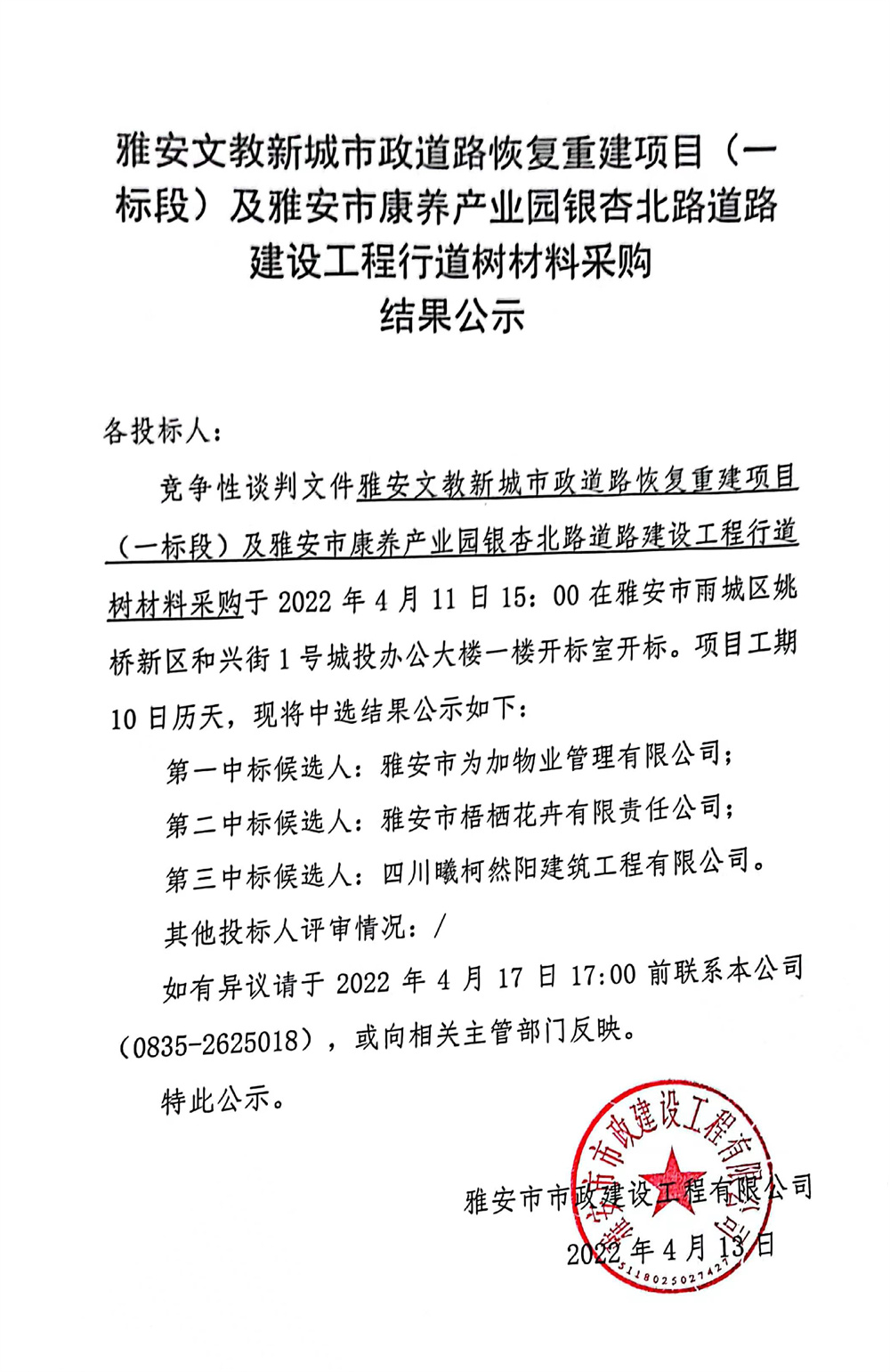雅安文教新城市政道路恢復(fù)重建項目(一標(biāo)段)及雅安市康養(yǎng)產(chǎn)業(yè)園銀杏北路道路建設(shè)工程行道樹材料采購結(jié)果公示