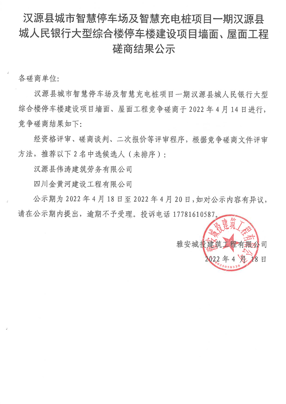 城投建工漢源縣城市智慧停車場及智慧充電樁項(xiàng)目一期漢源縣城人民銀行大型綜合樓停車樓建設(shè)項(xiàng)目墻面、屋面工程競爭磋商結(jié)果公示