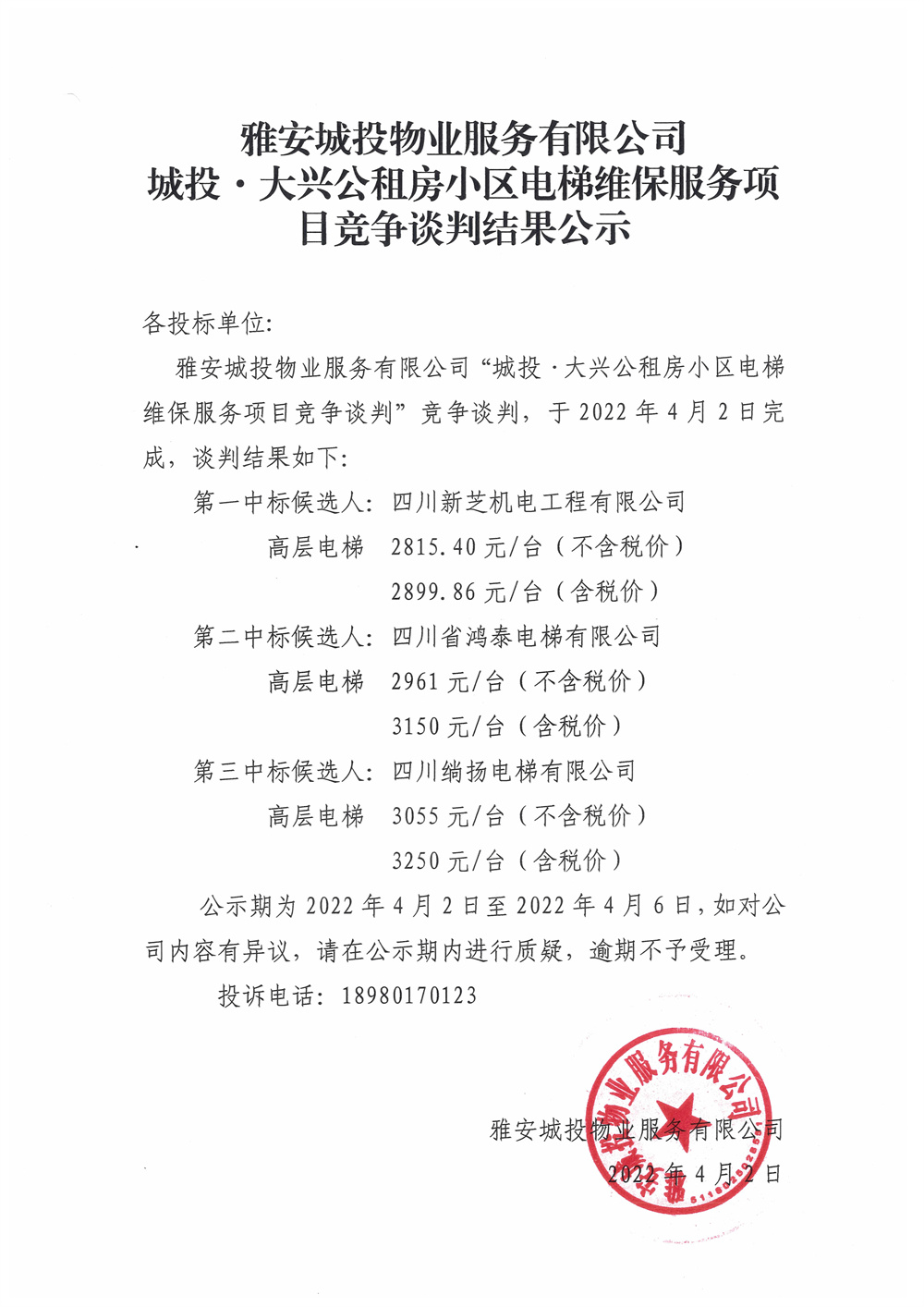 城投·大興公租房小區(qū)電梯維保服務(wù)項(xiàng)目競(jìng)爭(zhēng)談判結(jié)果公示