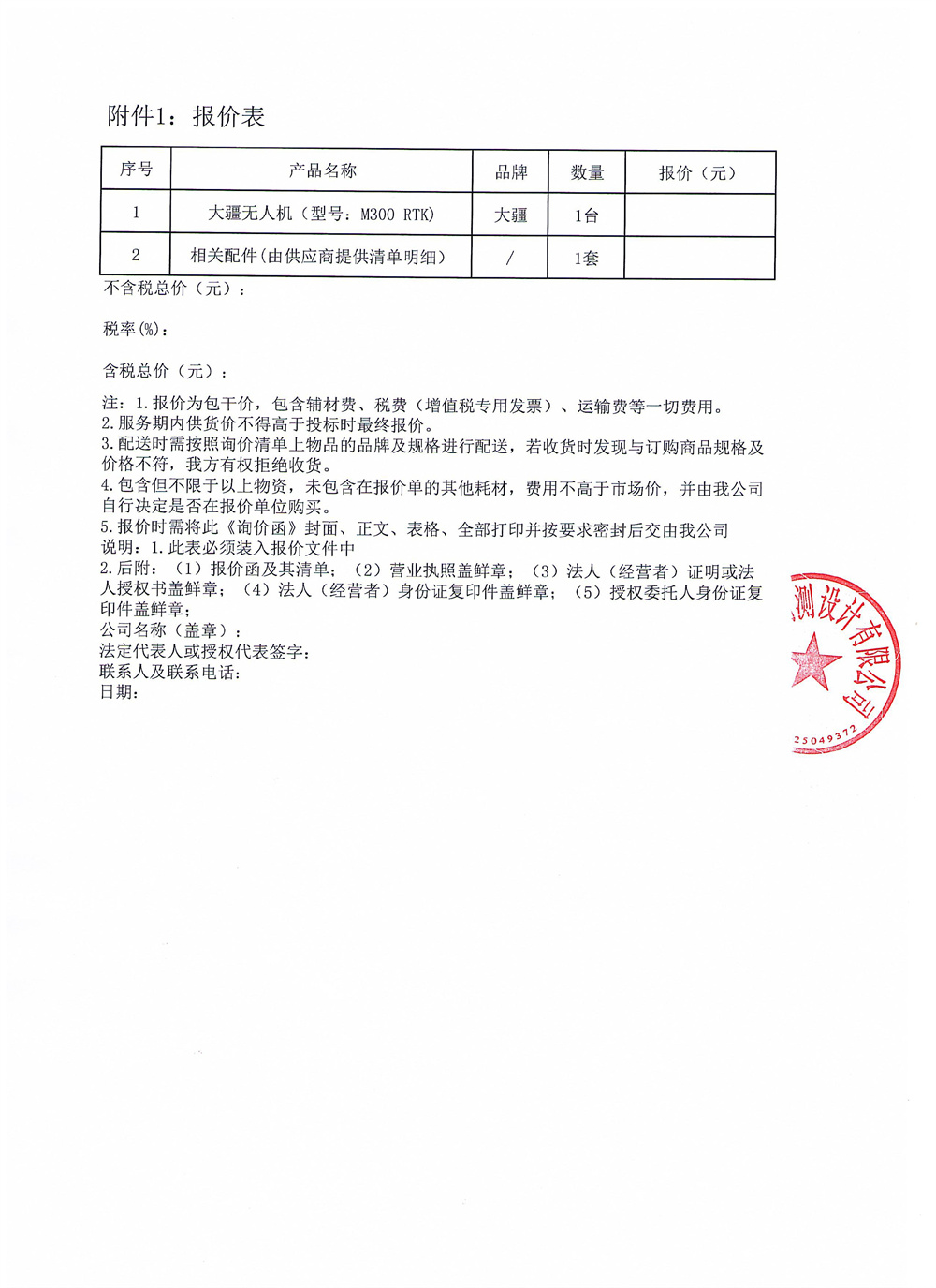 黎明勘測公司購買大疆無人機(jī)(型號(hào):M300 RTK)詢價(jià)函