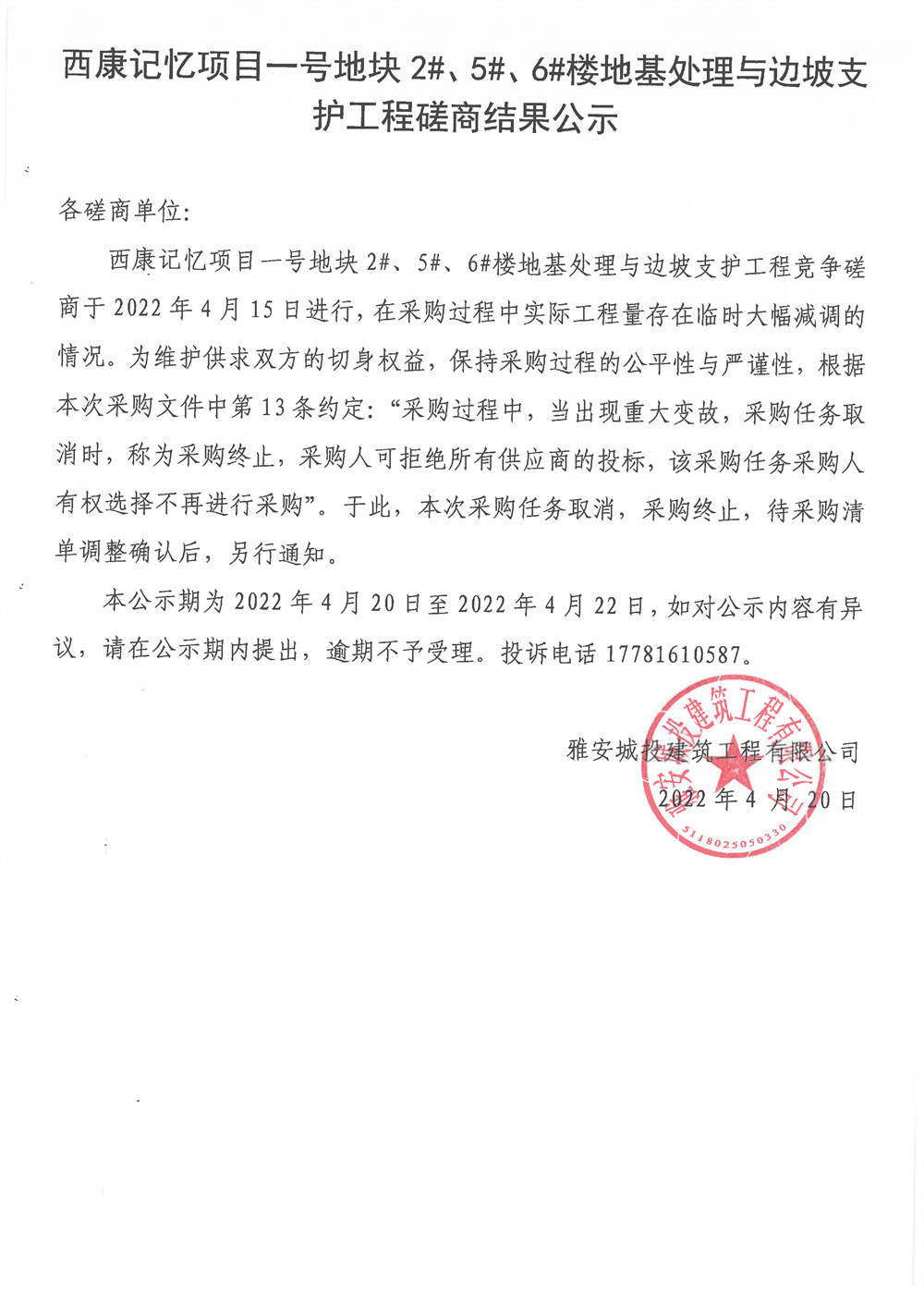 西康記憶項目一號地塊2#、5#、6#樓地基處理與邊坡支護工程磋商結(jié)果公示