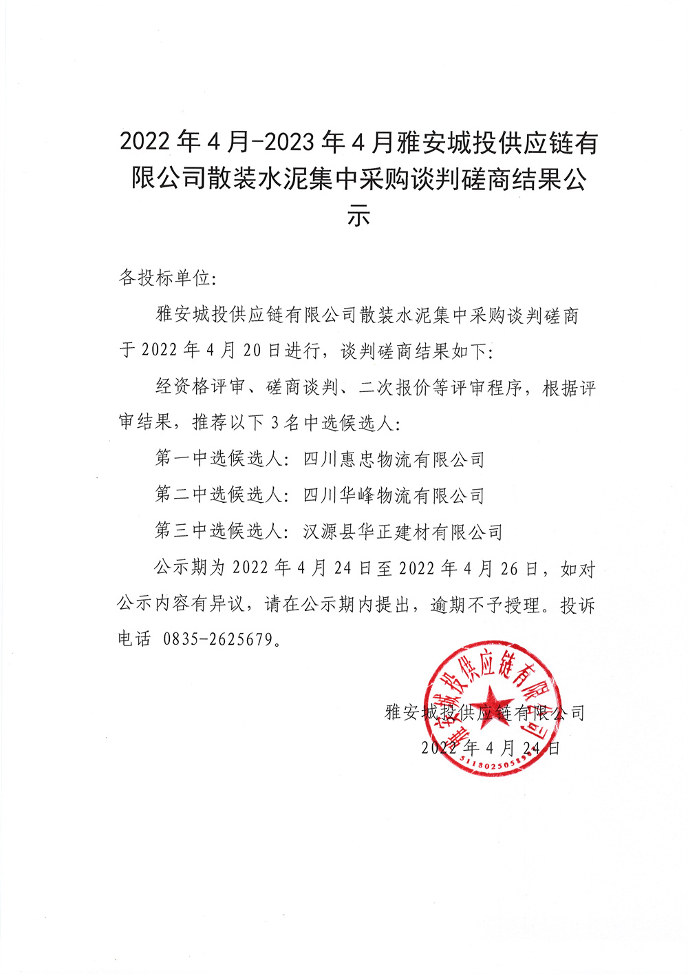 2022年4月-2023年4月雅安城投供應(yīng)鏈有限公司散裝水泥采購(gòu)談判磋商結(jié)果公示