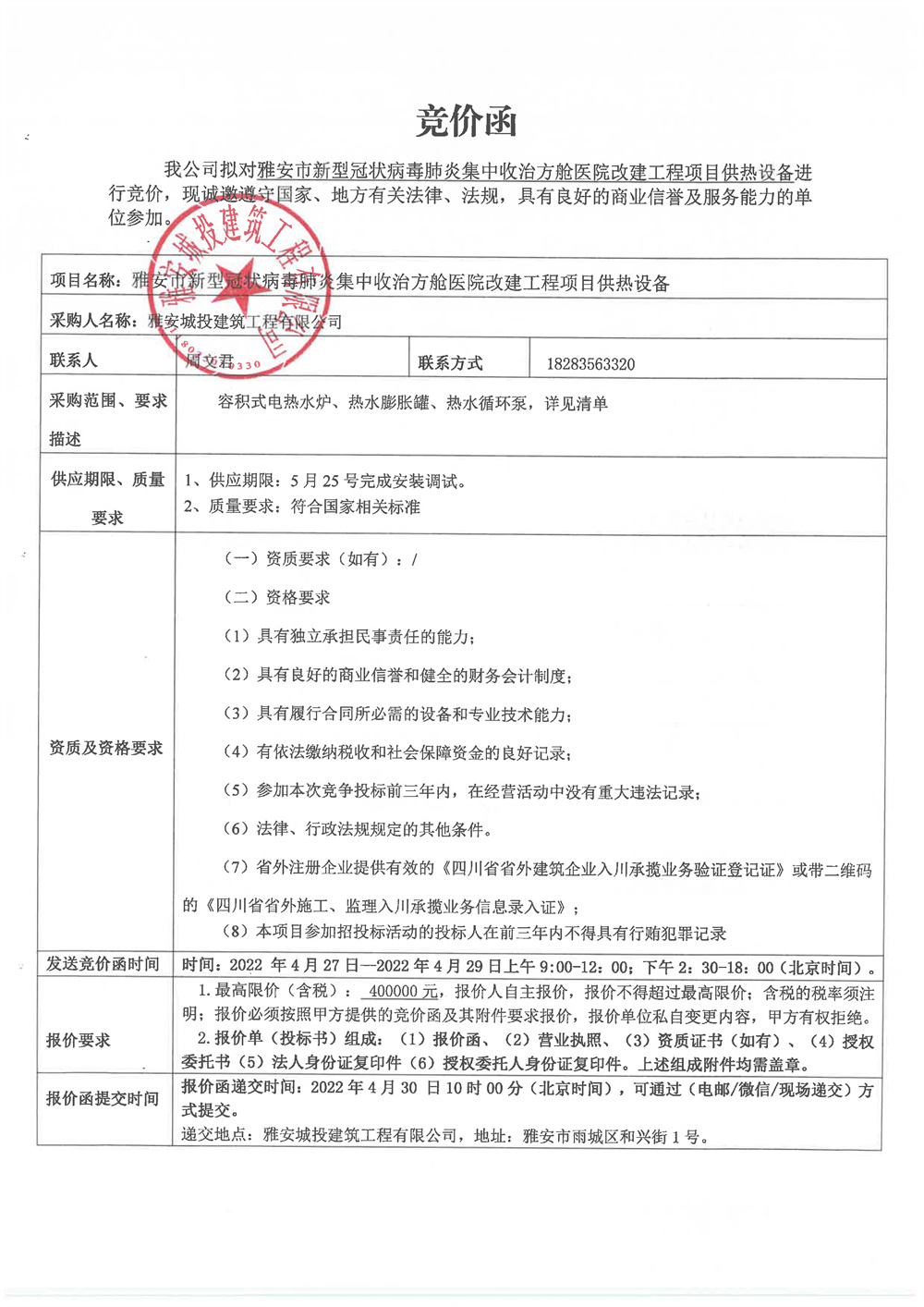 雅安市新型冠狀病毒肺炎集中收治方艙醫(yī)院改建工程項(xiàng)目供熱設(shè)備競(jìng)價(jià)函