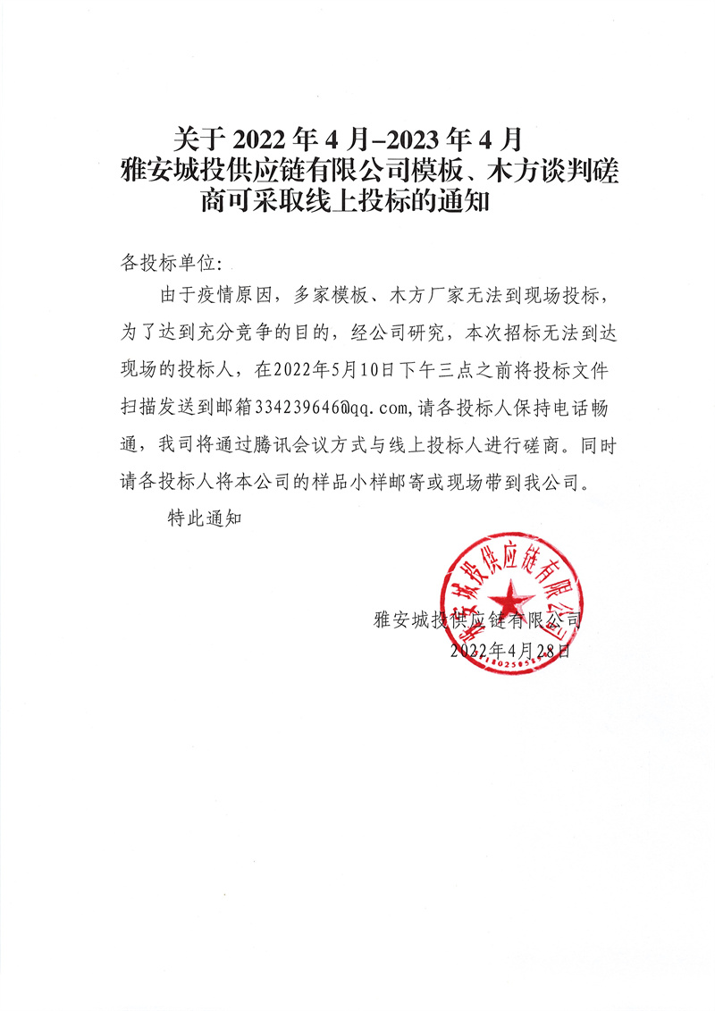 2022年4月-2023年4月雅安城投供應(yīng)鏈有限公司模板、木方談判磋商可采取線上投標的通知