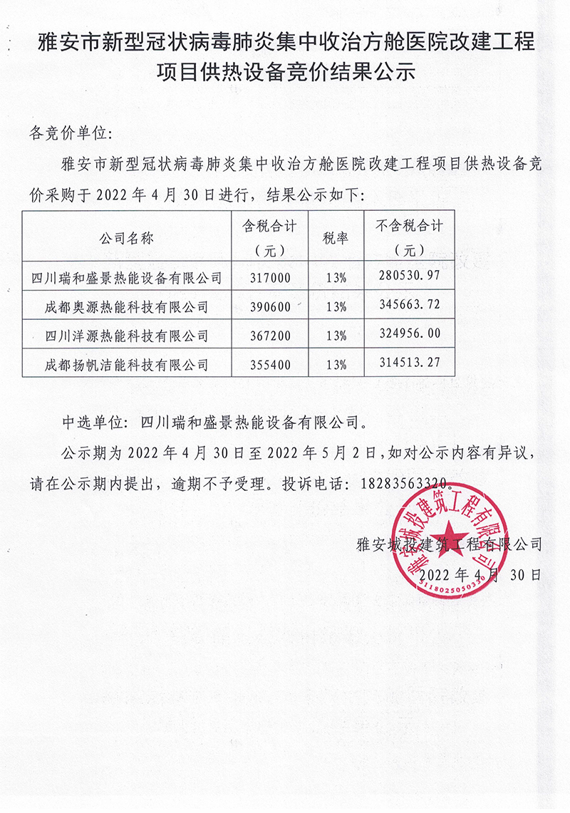 雅安市新型冠狀病毒肺炎集中收治方艙醫(yī)院改建工程項(xiàng)目供熱設(shè)備競(jìng)價(jià)結(jié)果公示