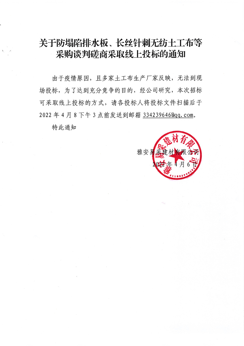 雅安易采建材有限公司防塌陷排水板、長(zhǎng)絲針刺無(wú)紡?fù)凉げ嫉炔少?gòu)談判磋商采取線(xiàn)上投標(biāo)的通知