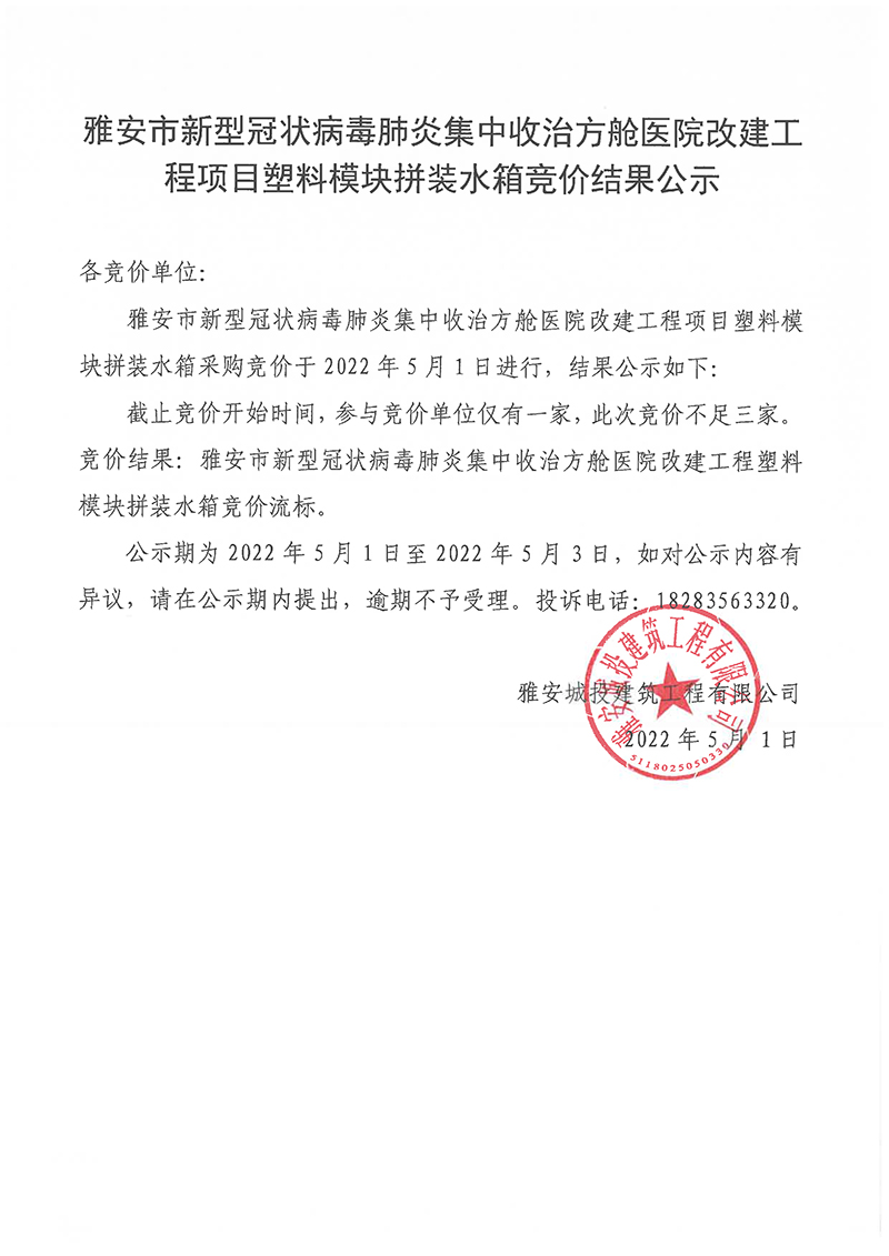 雅安市新型冠狀病毒肺炎集中收治方艙醫(yī)院改建工程項(xiàng)目塑料模塊拼裝水箱競價(jià)結(jié)果公示