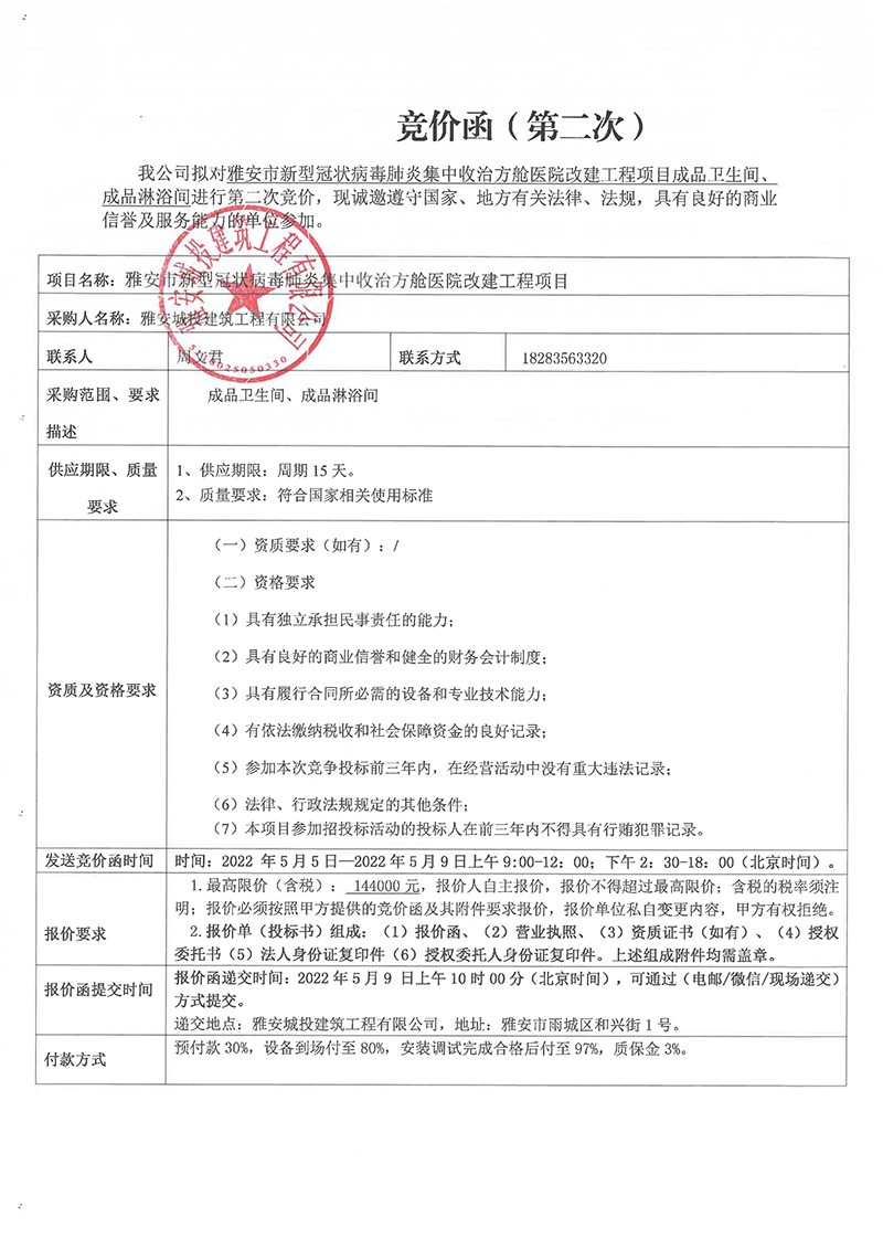 雅安市新型冠狀病毒肺炎集中收治方艙醫(yī)院改建工程項(xiàng)目成品衛(wèi)生間、淋浴間采購競(jìng)價(jià)函(第二次)