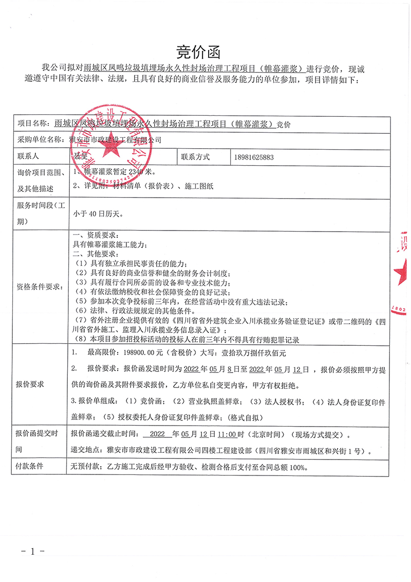雨城區(qū)鳳鳴垃圾填埋場永久性封場治理工程項目(帷幕灌漿)競價公告