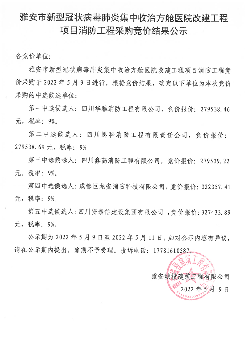 雅安市新型冠狀病毒肺炎集中收治方艙醫(yī)院改建工程項(xiàng)目消防工程采購(gòu)競(jìng)價(jià)結(jié)果公示