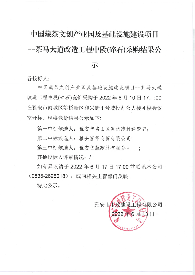 中國藏茶文創(chuàng)產(chǎn)業(yè)園及基礎(chǔ)設(shè)施建設(shè)項 茶馬大道改造工程中段碎石采購結(jié)果公示