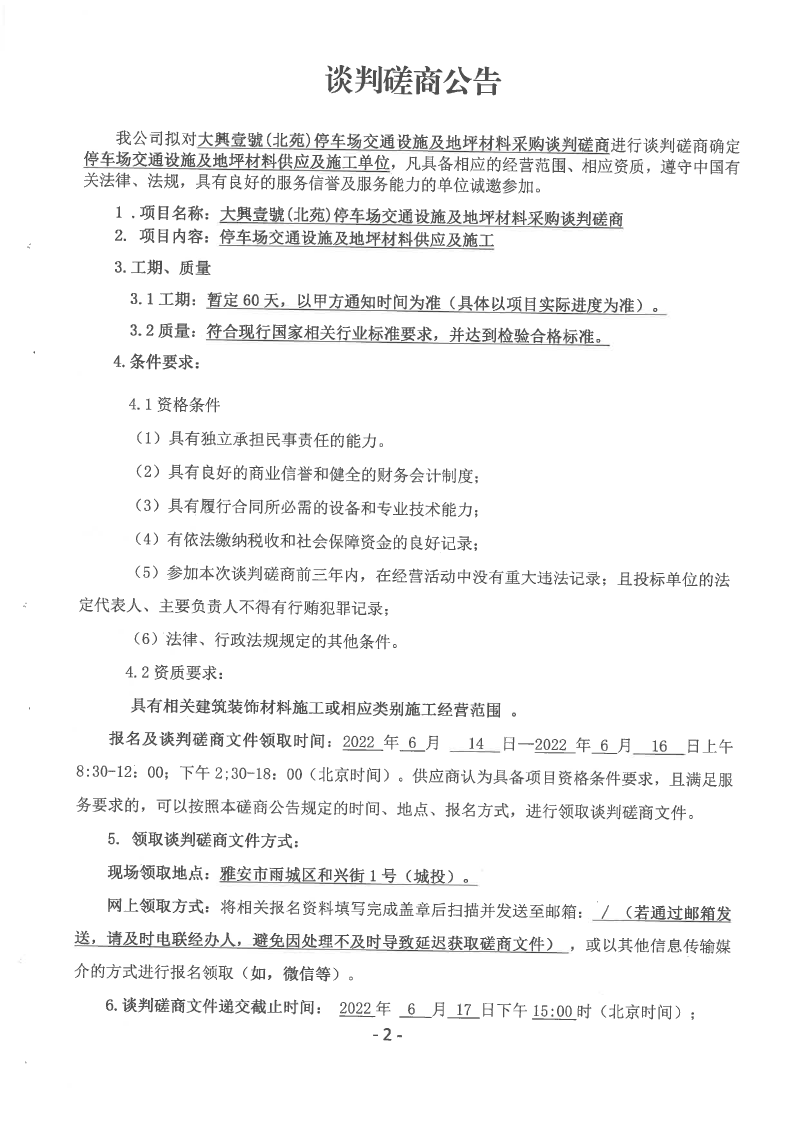 大興壹號(hào)(北苑)停車場(chǎng)交通設(shè)施及地坪材料采購談判磋商公告