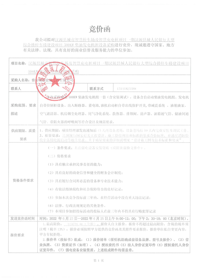 漢源縣城市智慧停車場及智慧充電樁項目一期漢源縣城人民銀行大型綜合樓停車樓建設(shè)項目500kw柴油發(fā)電機組設(shè)備采購競價公告