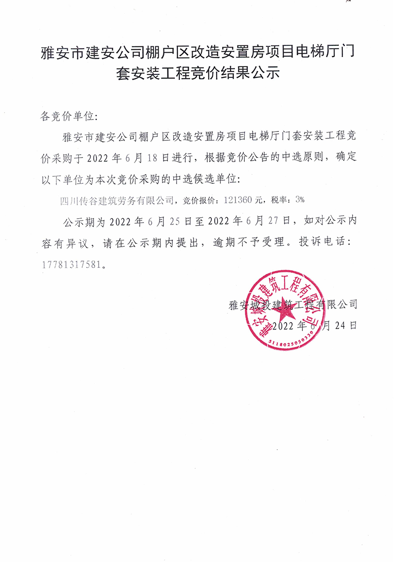 雅安市建安公司棚戶區(qū)改造安置房項(xiàng)目項(xiàng)目電梯廳門套安裝工程競價結(jié)果公示