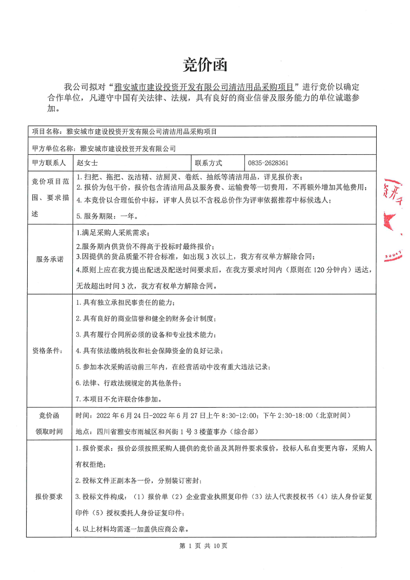 雅安城市建設(shè)投資開發(fā)有限公司清潔用品采購(gòu)項(xiàng)目競(jìng)價(jià)公告