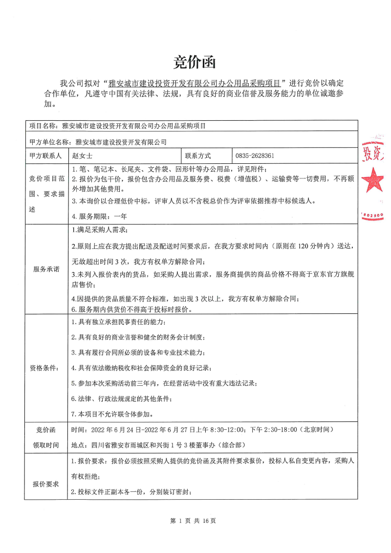 雅安城市建設(shè)投資開發(fā)有限公司辦公用品采購項(xiàng)目競價公告