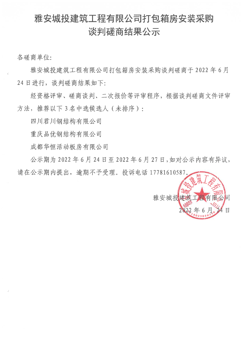 雅安城投建筑工程有限公司打包箱房安裝采購談判磋商結(jié)果公示