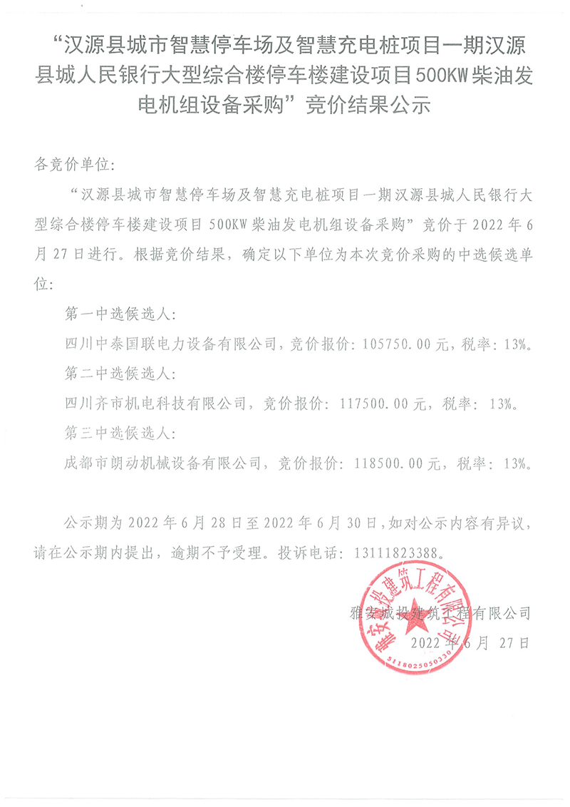 漢源縣城市智慧停車場及智慧充電樁項目一期漢源縣城人民銀行大型綜合樓停車樓建設(shè)項目500kw柴油發(fā)電機組設(shè)備采購競價結(jié)果公告