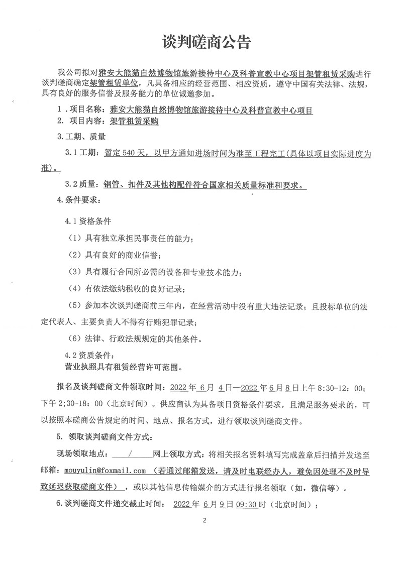 雅安大熊貓自然博物館旅游接待中心及科普宣教中心項(xiàng)目架管租賃采購談判磋商公告