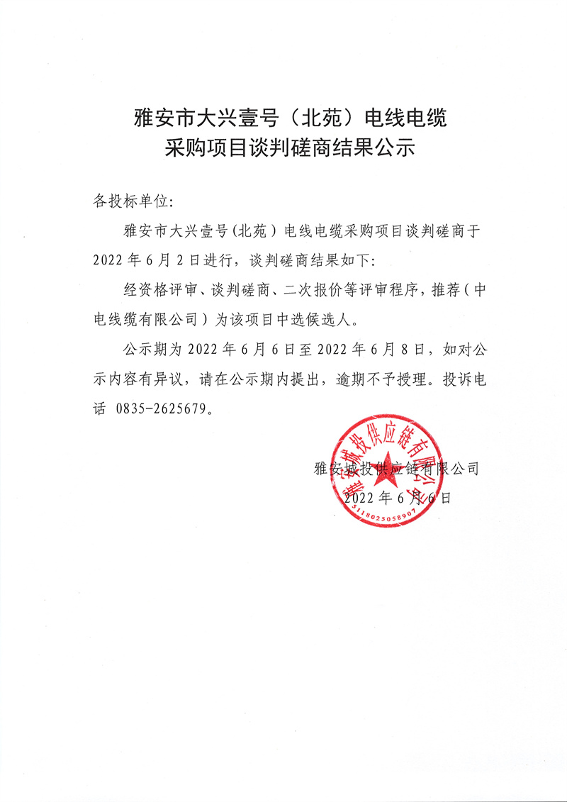 雅安城投供應鏈有限公司大興壹號(北苑)項目電線電纜談判磋商結果公示