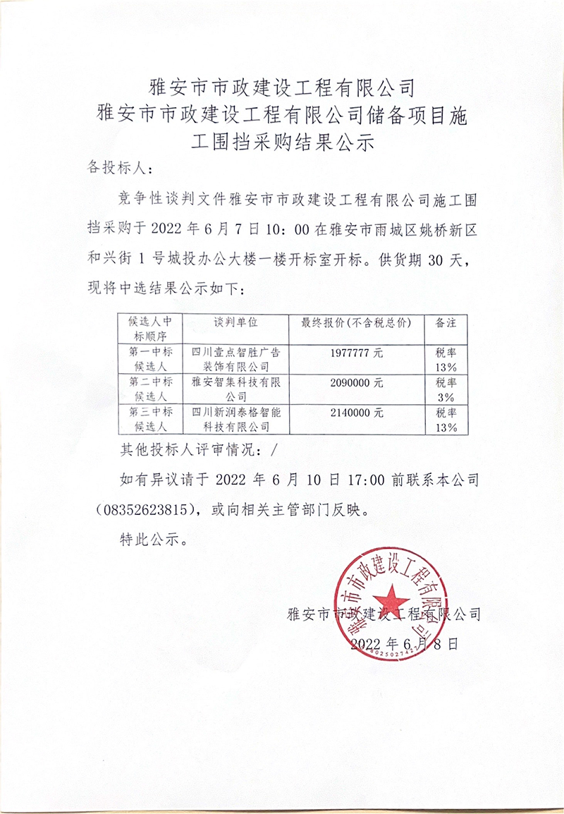雅安市市政建設工程有限公司儲備項目施工圍擋招采結(jié)果公示