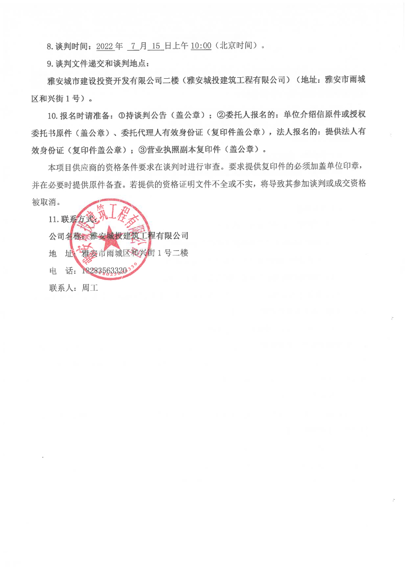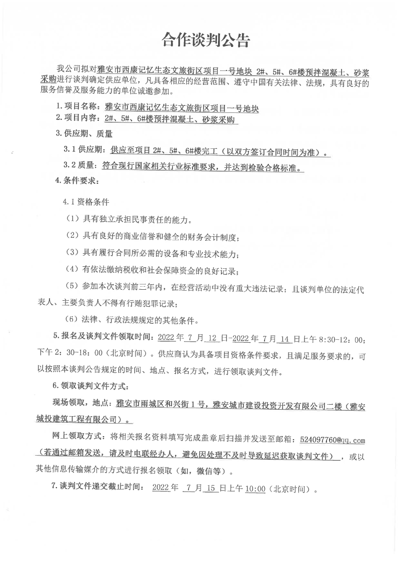 雅安市西康記憶生態(tài)文旅街區(qū)項(xiàng)目一號(hào)地塊2#、5#、6#樓預(yù)拌混凝土、砂漿采購(gòu)合作談判公告