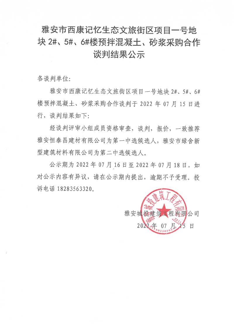 雅安市西康記憶生態(tài)文旅街區(qū)項目一號地塊2#、5#、6#樓預(yù)拌混凝土、砂漿采購合作談判結(jié)果公示