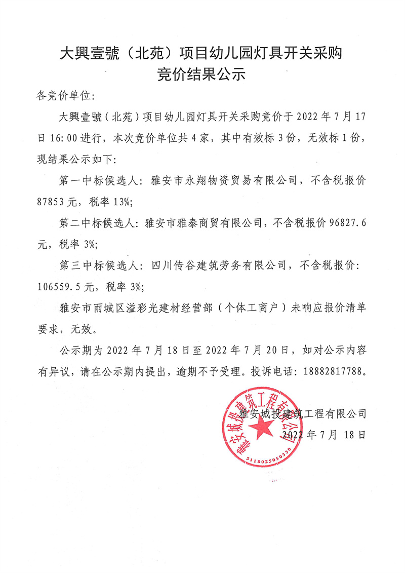 大興壹號(北苑)項目幼兒園燈具開關競價結果公示