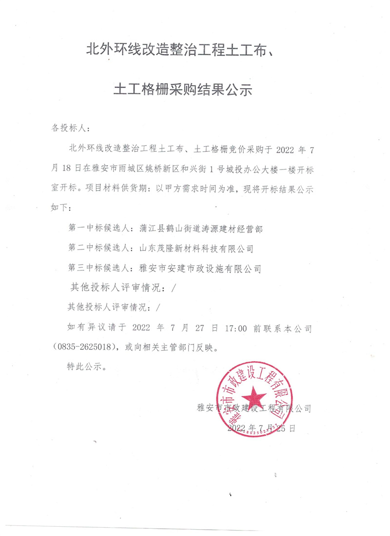 北外環(huán)線改造整治工程所需土工布、土工格柵采購結(jié)果公示