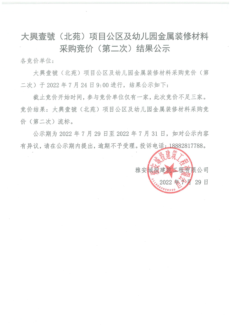 大興壹號(北苑)公區(qū)與幼兒園金屬裝修材料采購競價(第二次)結(jié)果公示