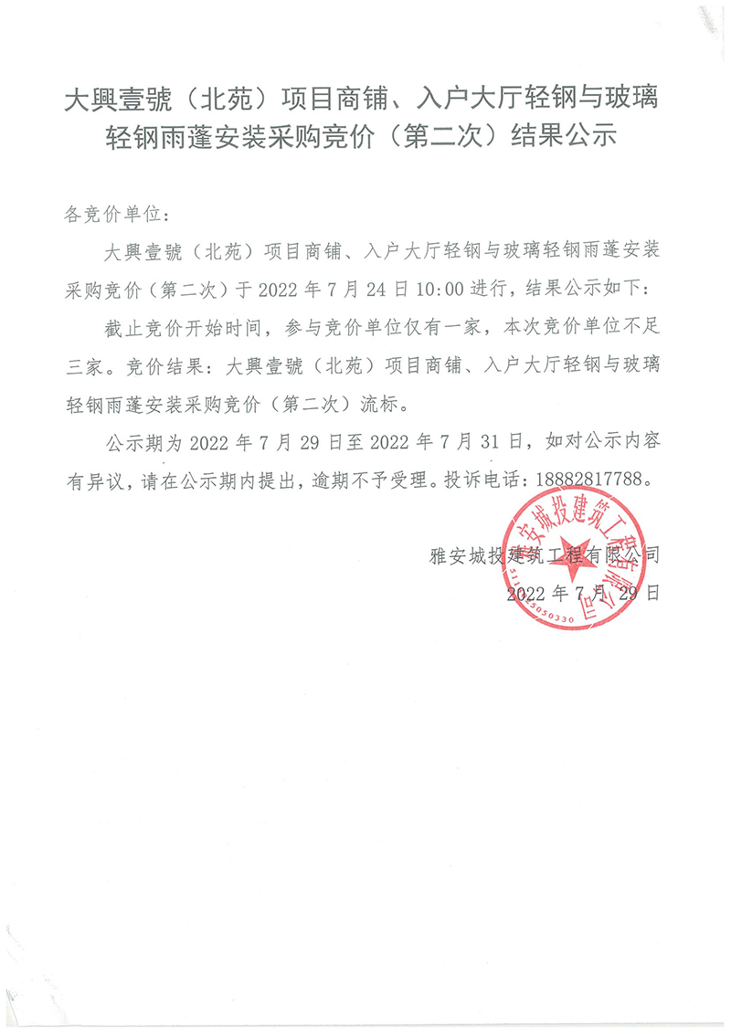 大興壹號(北苑)項目商鋪、入戶大廳輕鋼與玻璃輕鋼雨棚安裝采購競價(第二次)結(jié)果公示