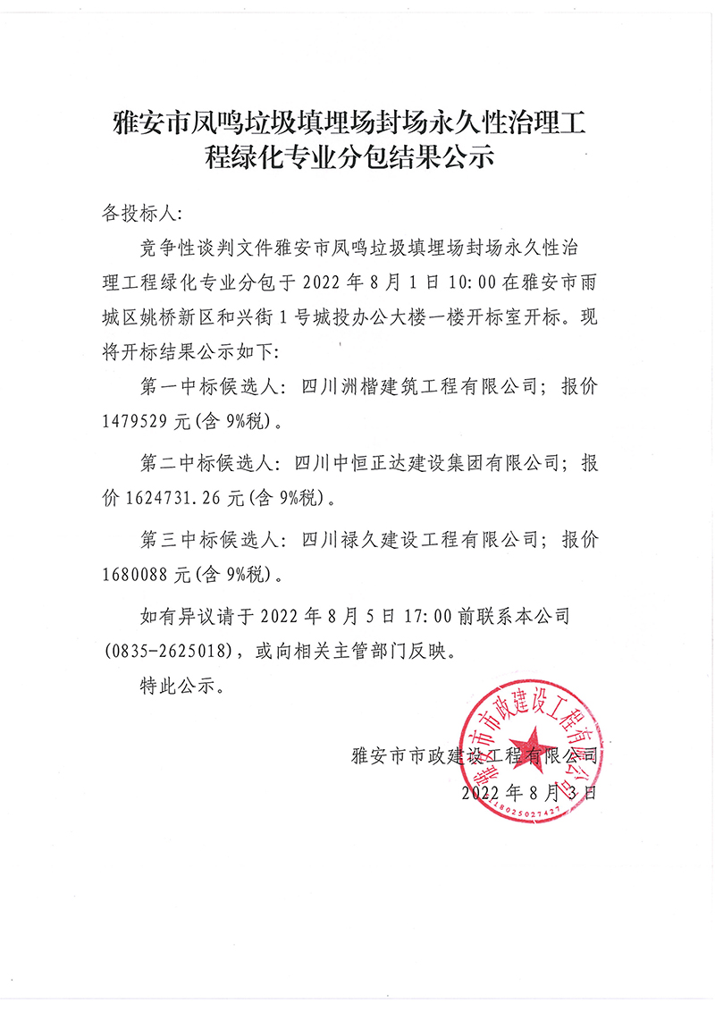 雅安市鳳鳴垃圾填埋場封場永久性治理工程項目綠化專業(yè)分包結(jié)果公示