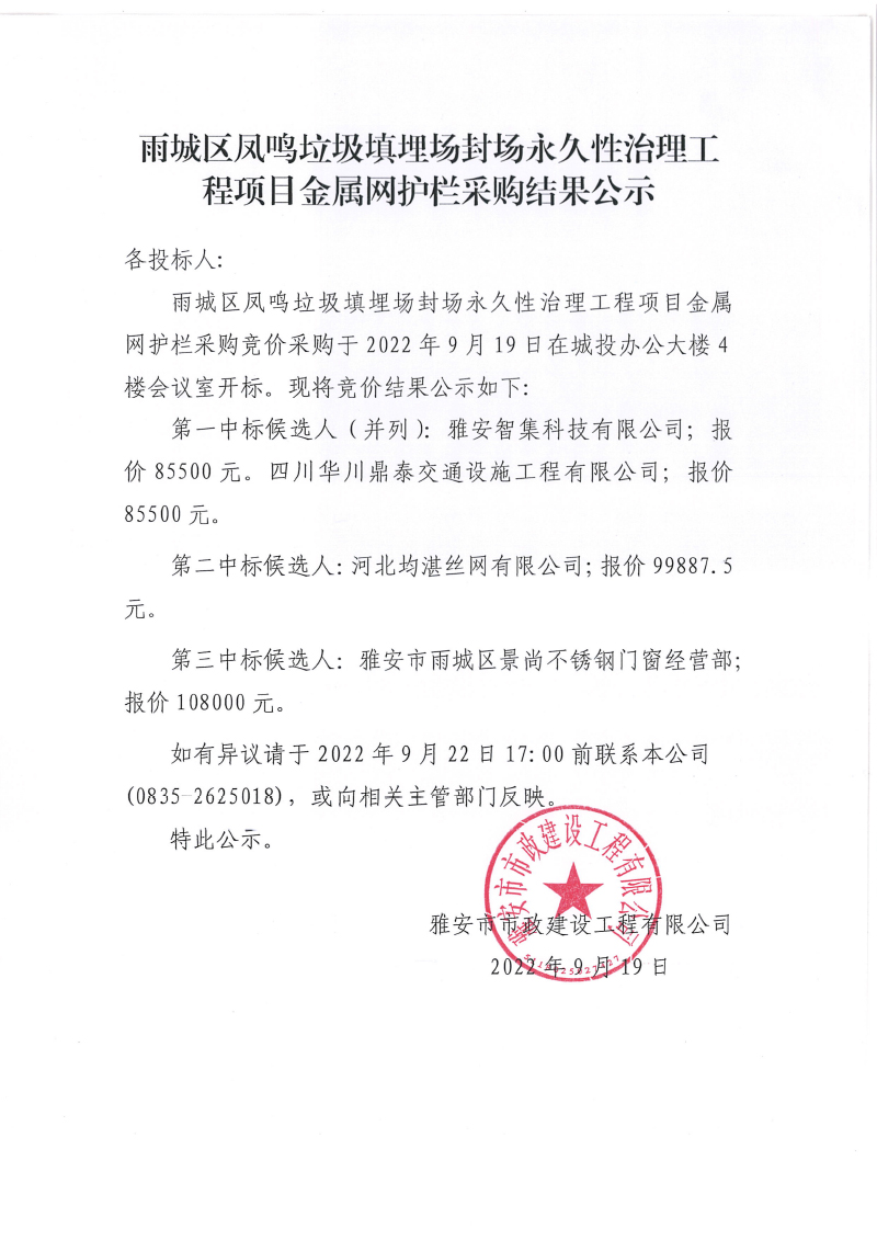 雨城區(qū)鳳鳴垃圾填埋場永久性封場治理工程項目金屬網(wǎng)護欄采購結(jié)果公示