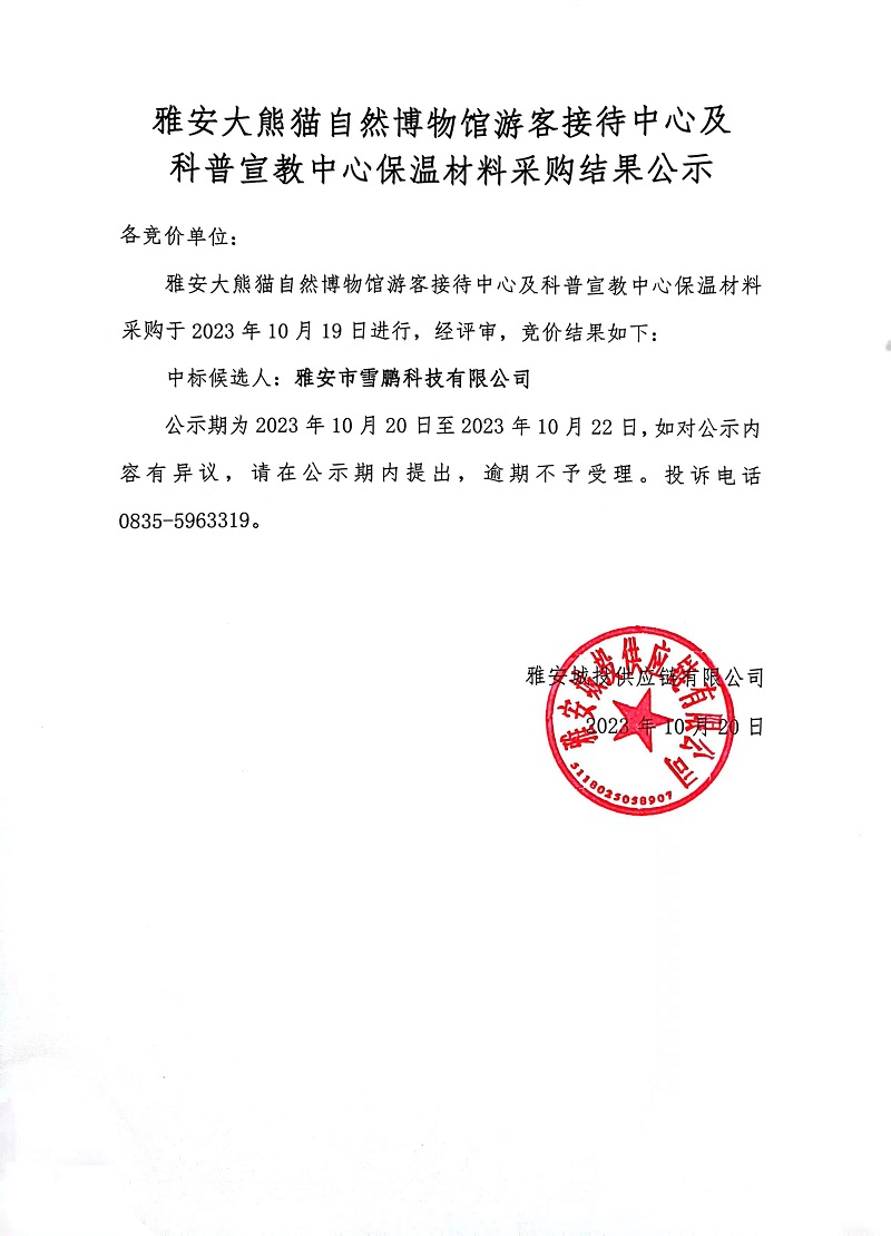 雅安大熊貓自然博物館游客接待中心及科普宣教中心保溫材料采購結(jié)果公示
