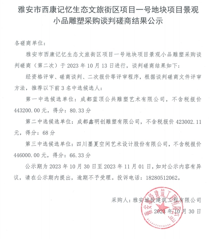 雅安市西康記憶生態(tài)文旅街區(qū)項目一號地塊項目景觀小品雕塑采購談判磋商結(jié)果公示
