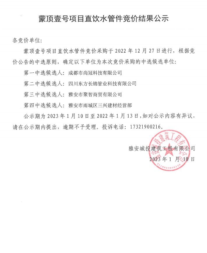 蒙頂壹號項目直飲水管件競價結(jié)果公示