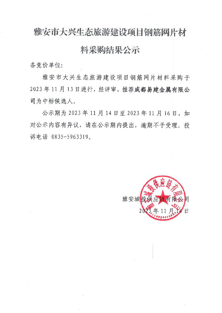雅安市大興生態(tài)旅游建設(shè)項(xiàng)目鋼筋網(wǎng)片材料采購結(jié)果公示