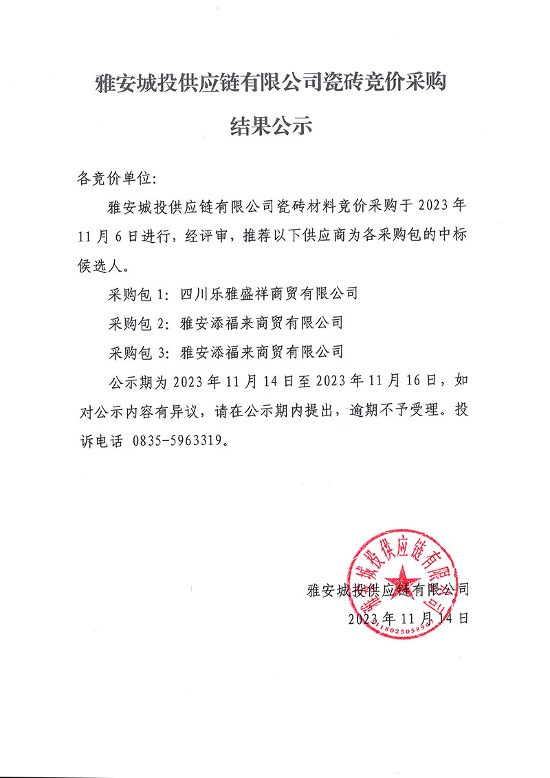 雅安城投供應(yīng)鏈有限公司瓷磚競價(jià)采購結(jié)果公示