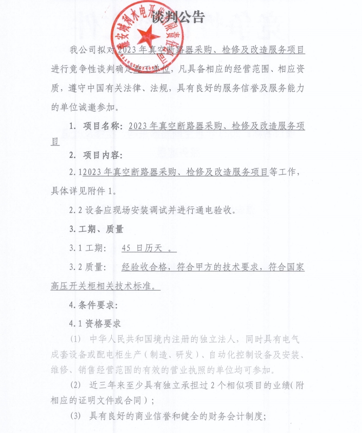 2023年真空斷路器采購(gòu)、檢修及改造服務(wù)項(xiàng)目談判公告