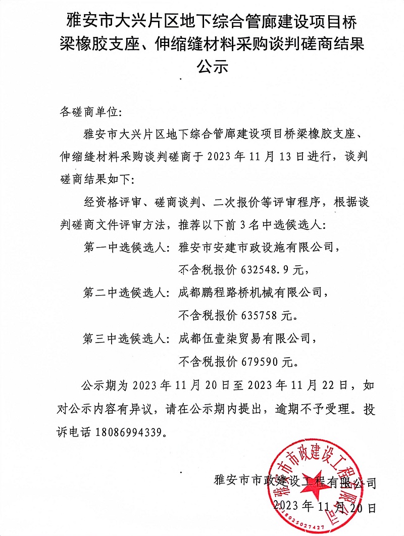 雅安市大興片區(qū)地下綜合管廊建設(shè)項目橋梁橡膠支座、伸縮縫材料采購談判磋商結(jié)果公示