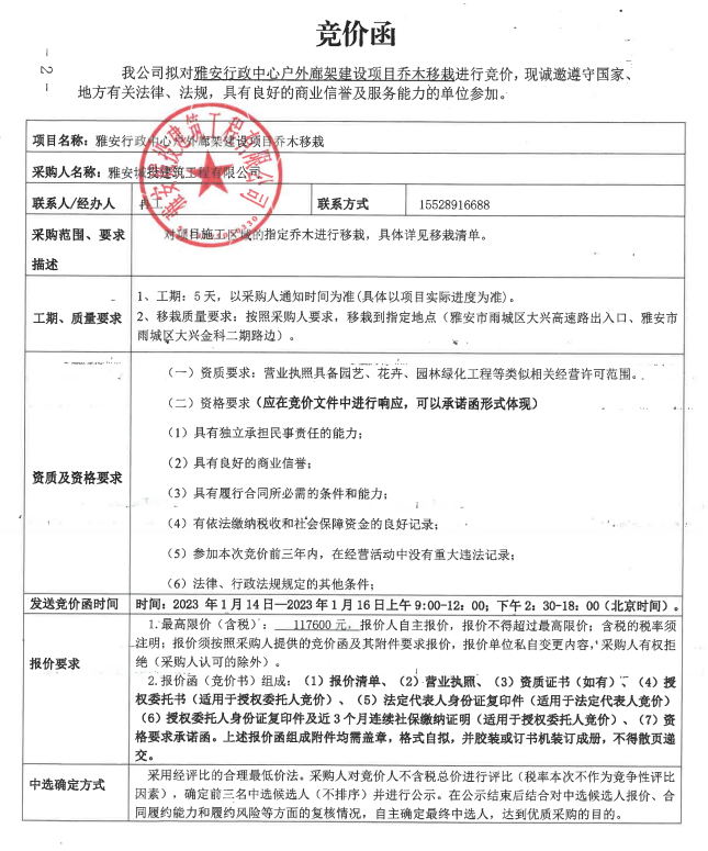 雅安行政中心戶外廊架建設(shè)項目喬木移栽競價公告