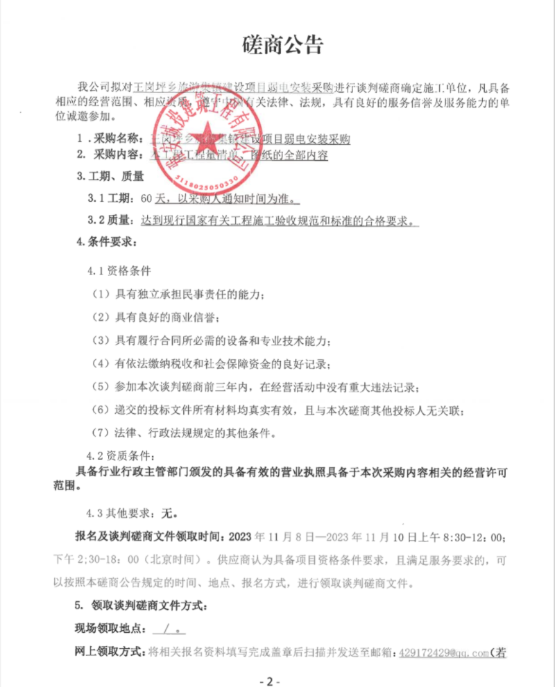 王崗坪鄉(xiāng)旅游集鎮(zhèn)建設(shè)項(xiàng)目弱電安裝采購談判磋商公告