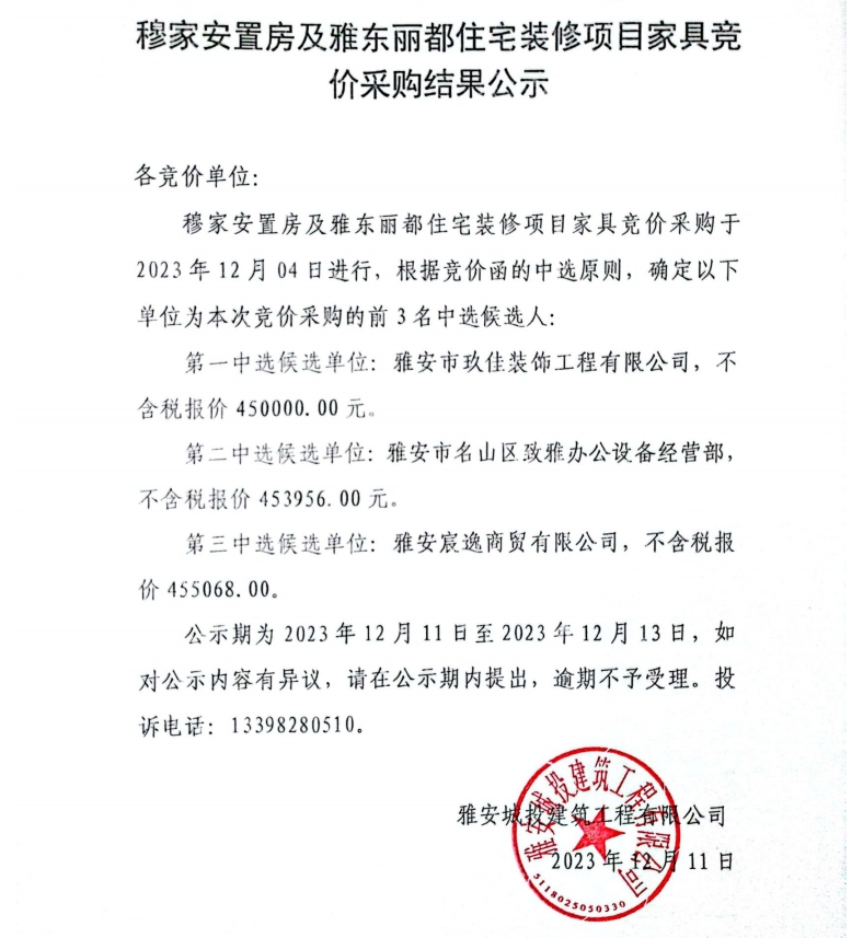 穆家安置房及雅東麗都住宅裝修項目家具采購競價采購結果公示