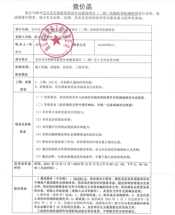 寶興靈關(guān)保障性租賃住房建設(shè)項(xiàng)目(二期)挖掘機(jī)等機(jī)械租賃競價公告