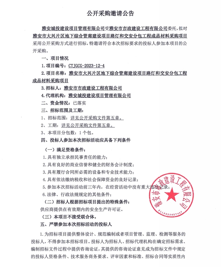 雅安市大興片區(qū)地下綜合管廊建設(shè)項(xiàng)目路燈和交安分包工程成品材料采購(gòu)項(xiàng)目公開(kāi)采購(gòu)邀請(qǐng)公告