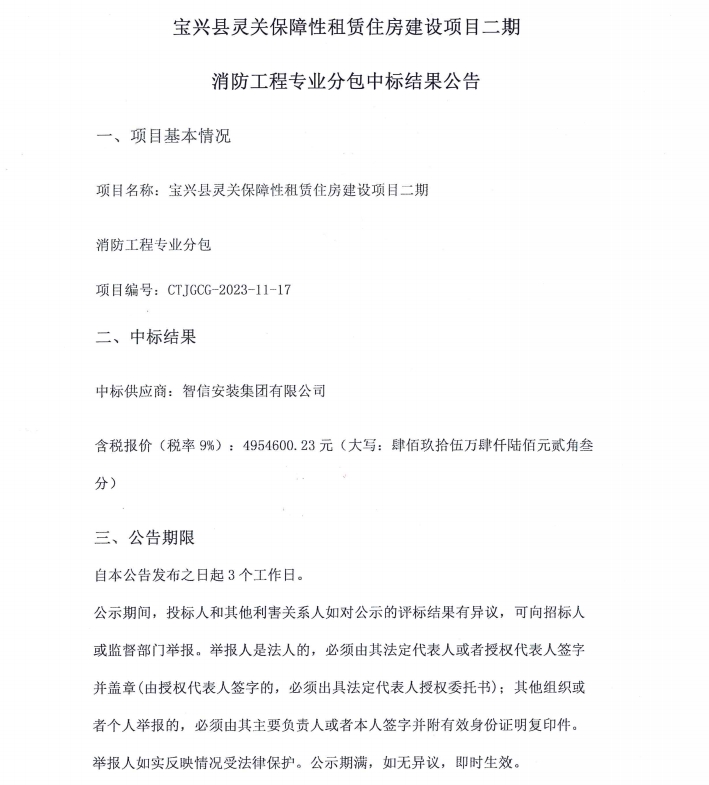 寶興縣靈關(guān)保障性租賃住房建設(shè)項目二期消防工程專業(yè)分包中標結(jié)果公告