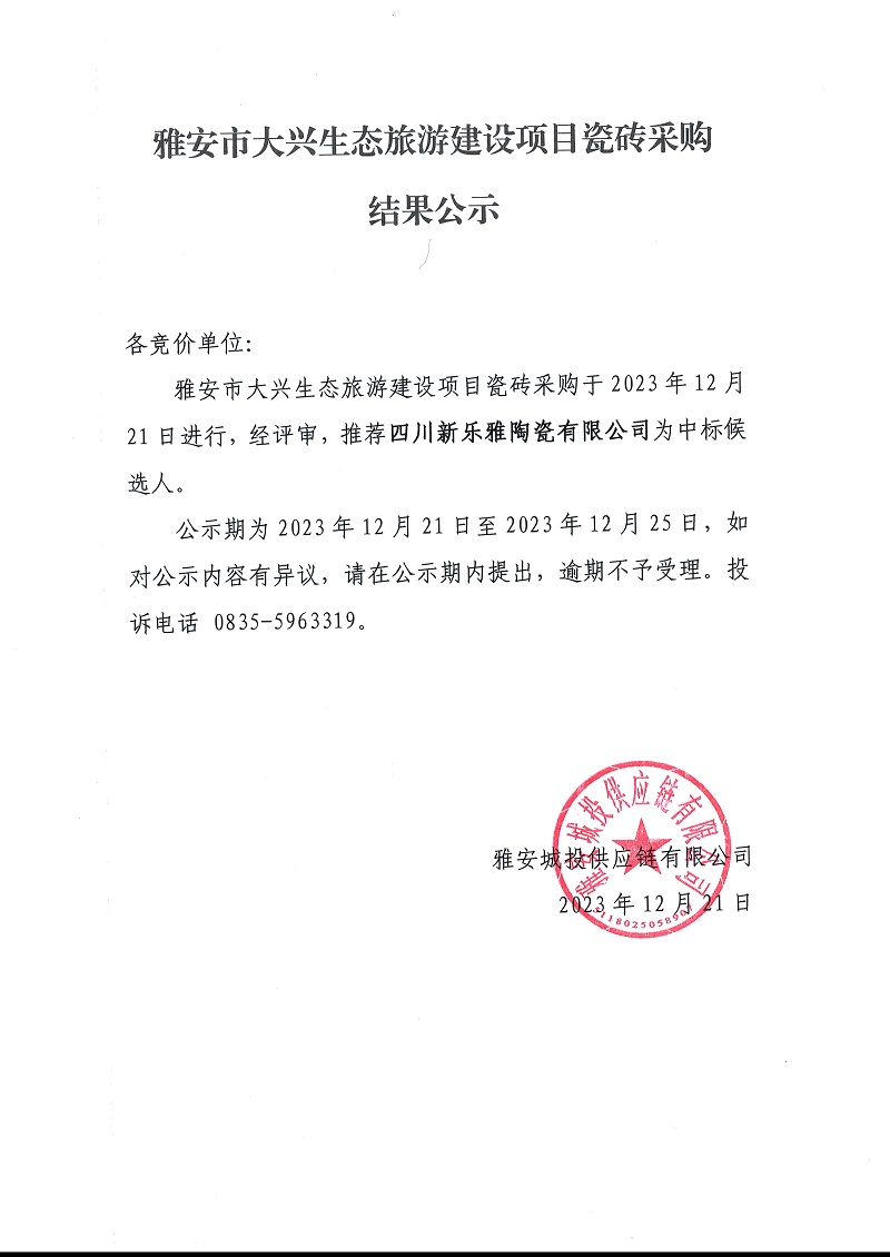雅安市大興生態(tài)旅游建設項目瓷磚采購結果公示