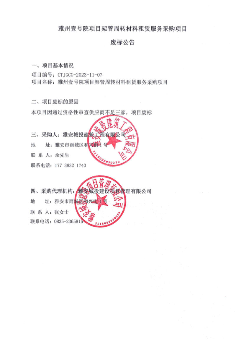 雅州壹號項(xiàng)目架管周轉(zhuǎn)材料租賃服務(wù)采購項(xiàng)目廢標(biāo)公告