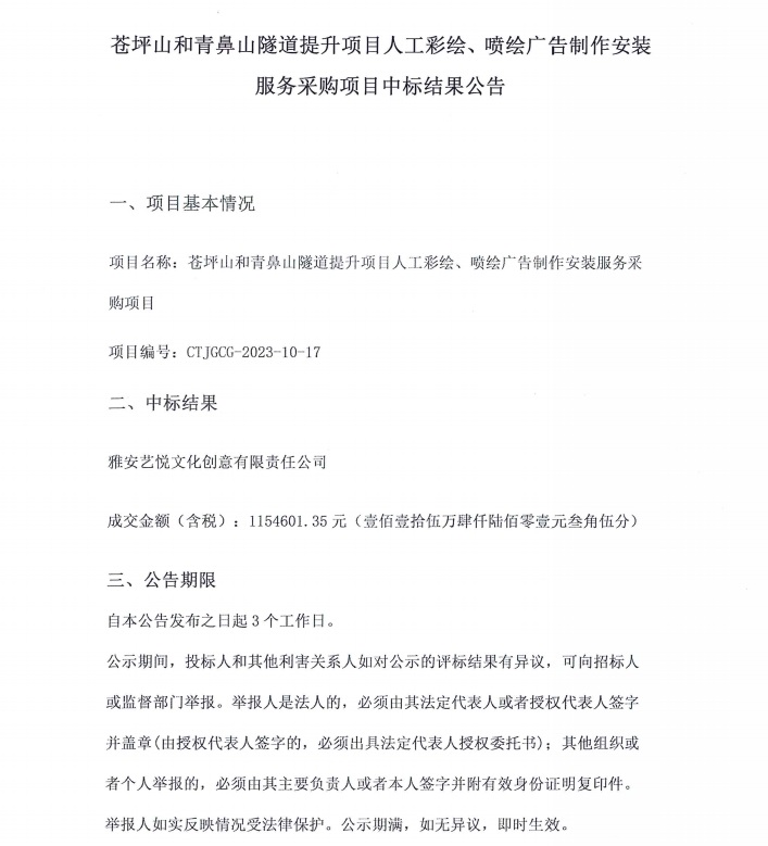 蒼坪山和青鼻山隧道提升項目人工彩繪、噴繪廣告制作安裝服務(wù)采購項目中標(biāo)結(jié)果公告